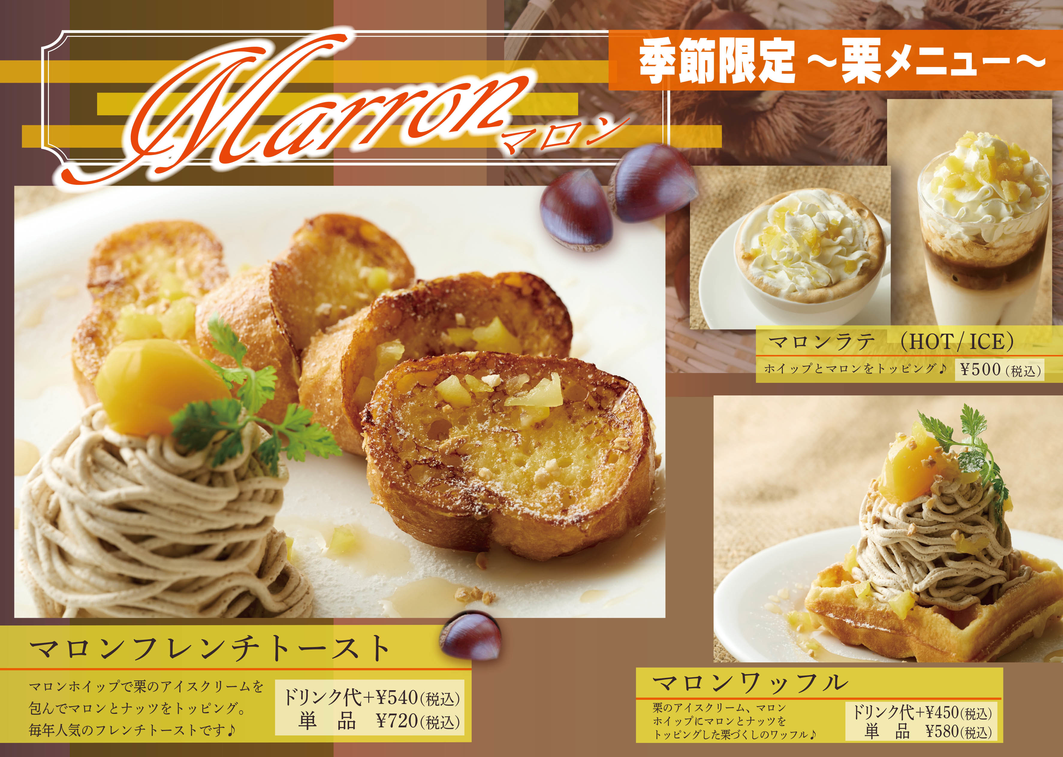 新着情報 NEWS TOP 新着情報 2021.09.16 珈琲元年 9月27日から季節限定メニューがスタート 毎年人気の栗メニューが期間限定でまもなく始まります (開始日は店舗ごとに変更になる場合がございますので各店舗にご確認願いします) デザートは、栗のアイスクリームに栗のホイップをたっぷりとその上に栗をのせた栗づくしの フレンチトーストとワッフルをご用意致しました。 ドリンクは、ホイップクリームがたっぷりのった栗のカフェラテ(ホット/アイス)を ご用意致しました。 【香り高い一杯のコーヒー】が作り出す【安らぎ】と【活力】をお届けするを合言葉に! そんな珈琲元年の季節メニューの紹介でした。 次の記事へ 一覧へ戻る 前の記事へ カテゴリー メディア情報(15) お知らせ(48) 珈琲元年(143) セレージャ(8) Fuji Coffee News(72) その他(6) アーカイブ 2025年 2025年12月(2) 2025年11月(2) 2025年10月(2) 2025年9月(4) 2025年8月(2) 2025年7月(2) 2025年6月(3) 2025年5月(4) 2025年4月(2) 2025年3月(3) 2025年2月(2) 2025年1月(2) 2024年 2024年12月(3) 2024年11月(3) 2024年10月(5) 2024年9月(2) 2024年8月(5) 2024年7月(3) 2024年6月(3) 2024年5月(4) 2024年4月(5) 2024年3月(2) 2024年2月(2) 2024年1月(2) 2023年 2023年12月(4) 2023年11月(3) 2023年10月(5) 2023年9月(1) 2023年8月(1) 2023年7月(1) 2023年6月(2) 2023年4月(1) 2023年3月(4) 2023年2月(2) 2023年1月(1) 2022年 2022年12月(4) 2022年11月(5) 2022年10月(2) 2022年9月(4) 2022年8月(8) 2022年7月(3) 2022年6月(4) 2022年5月(5) 2022年4月(2) 2022年3月(5) 2022年2月(7) 2022年1月(3) 2021年 2021年12月(8) 2021年11月(5) 2021年10月(5) 2021年9月(11) 2021年8月(6) 2021年7月(5) 2021年6月(4) 2021年5月(5) 2021年4月(5) 2021年3月(8) 2021年2月(4) 2021年1月(4) 2020年 2020年12月(6) 2020年11月(2) 2020年10月(9) 2020年9月(5) 2020年8月(3) 2020年7月(3) 2020年6月(2) 2020年5月(7) 2020年4月(13) 2020年3月(2) 2020年2月(2) 2020年1月(2)